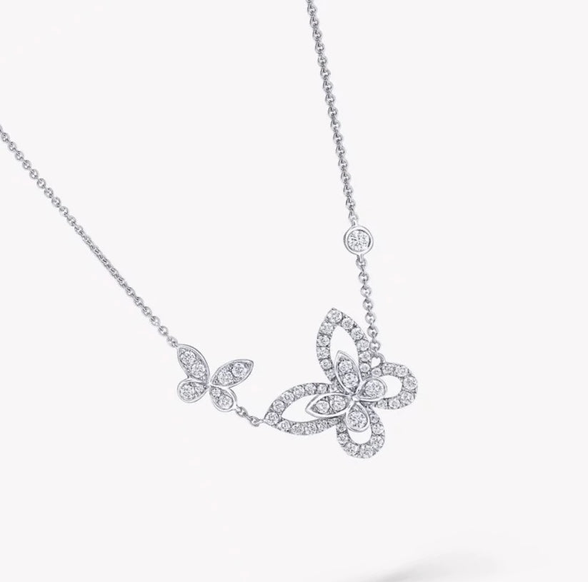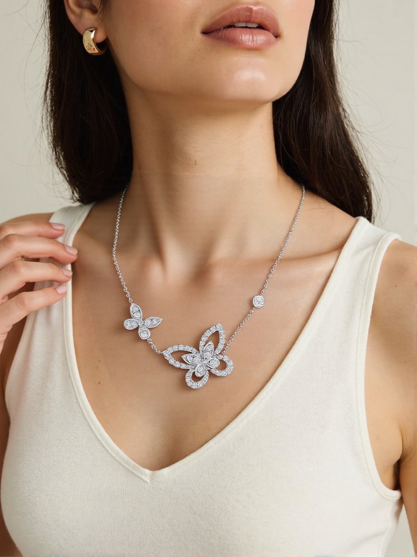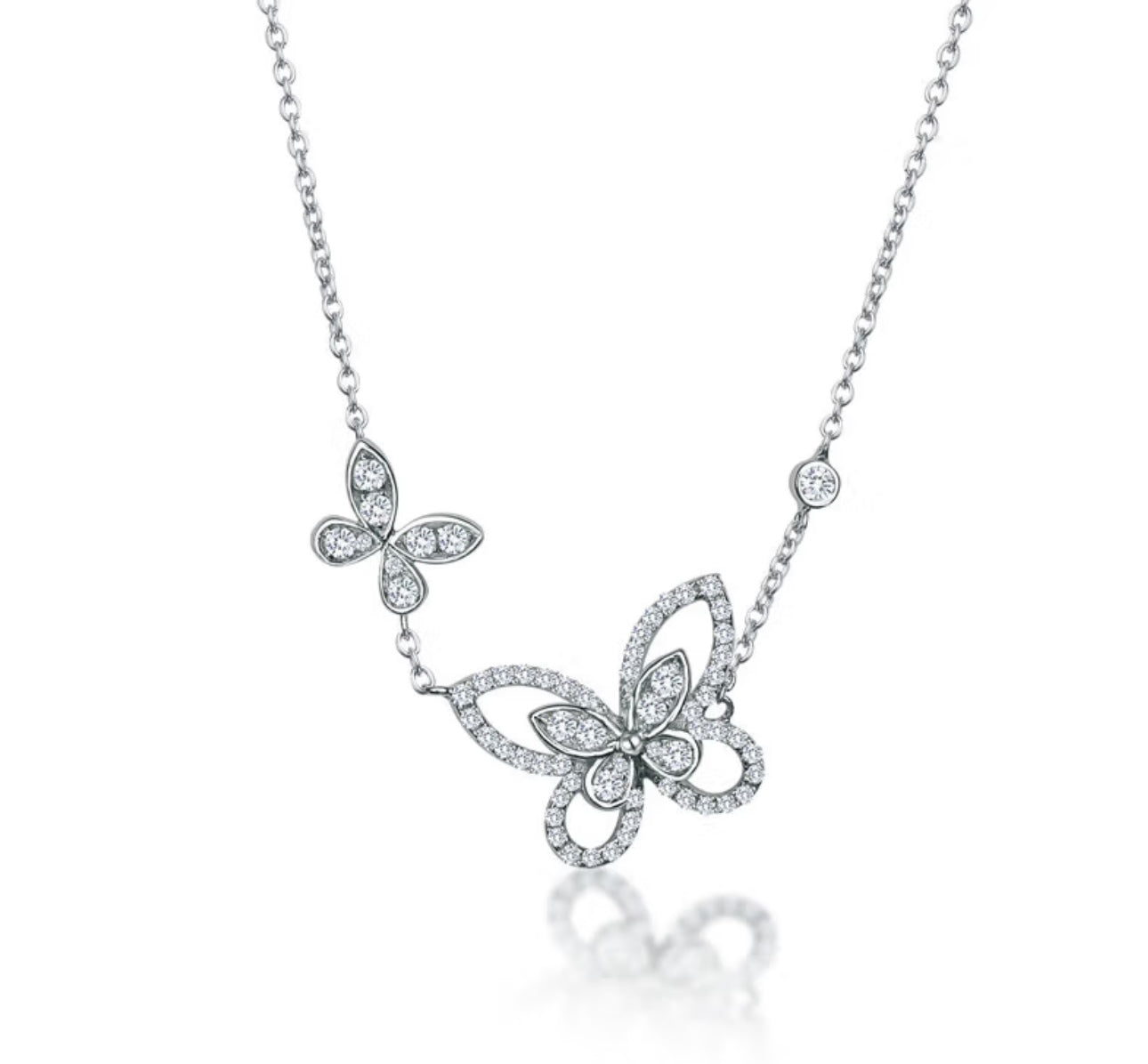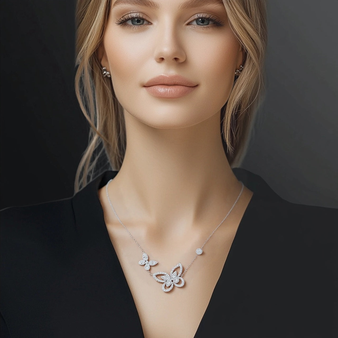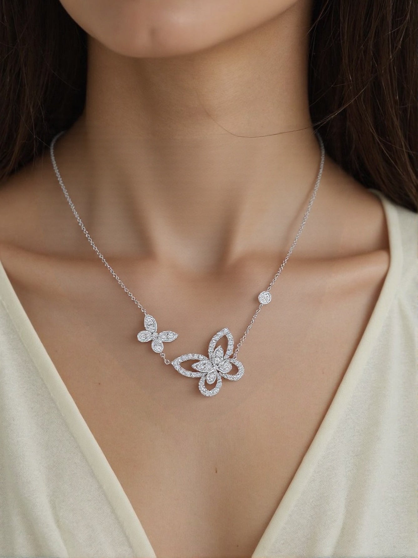 A stunning necklace showcasing two uniquely designed butterflies, each adorned with pavé-set diamonds.