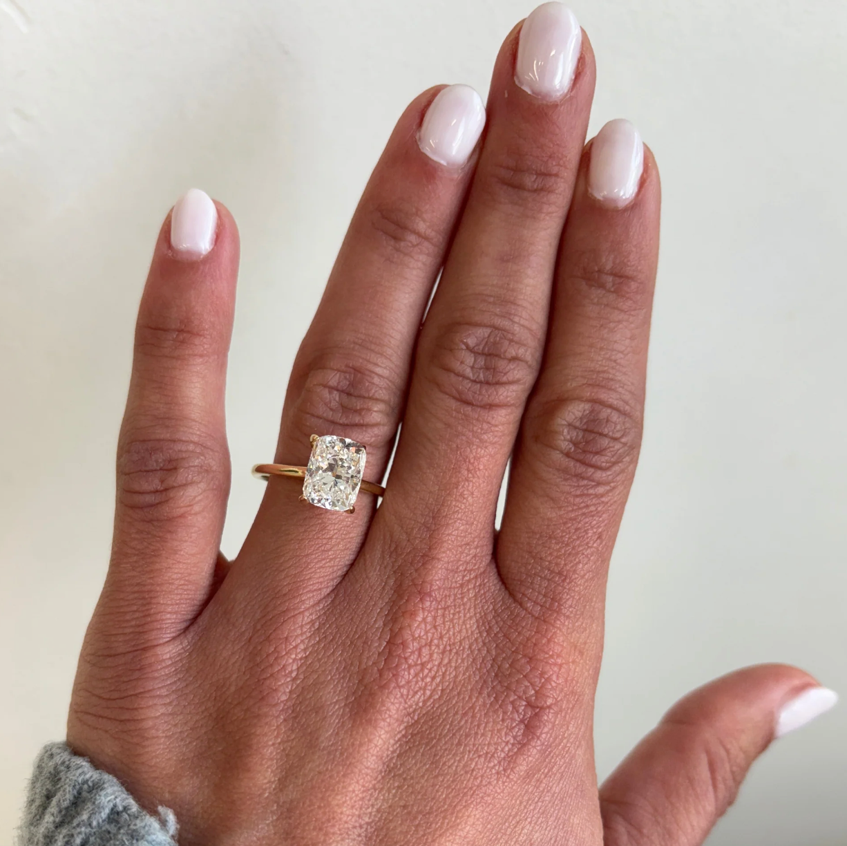 This beautiful engagement ring is the one and only classic Elongated Cushion lab grown diamond 14K gold solitaire engagement ring.